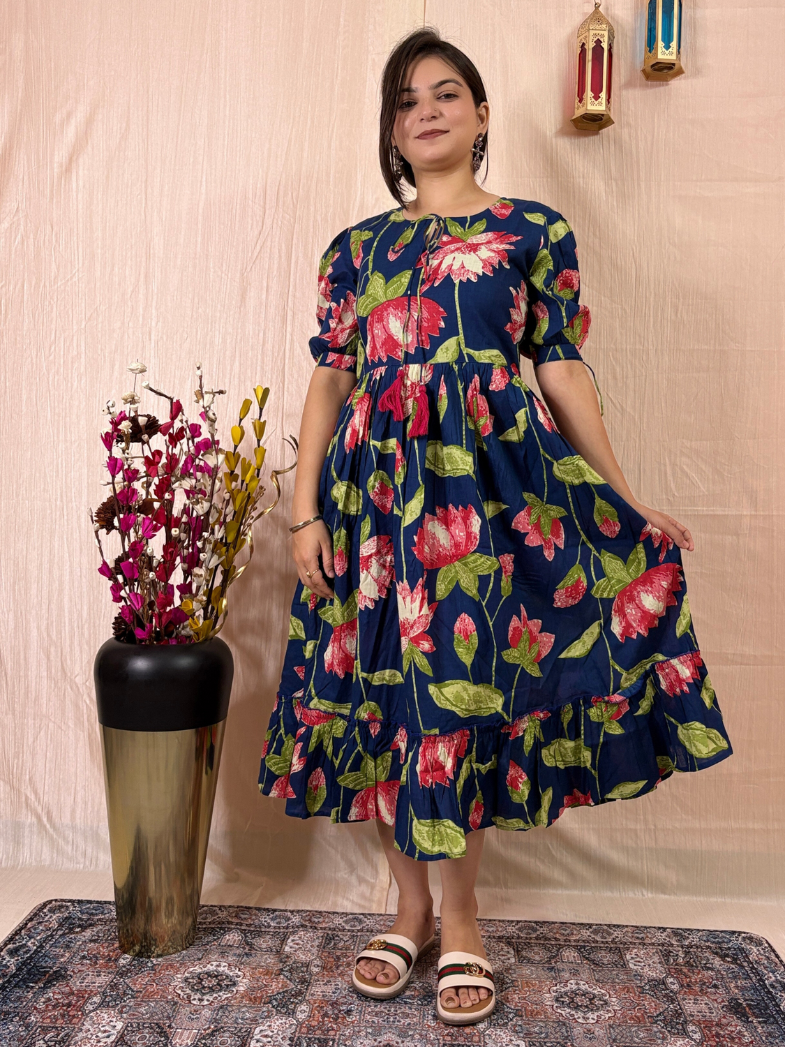 Design: Features a striking, large-scale Floral Print on a sophisticated Navy Blue base, giving it a beautiful "Midnight Bloom" look. The dress has a flattering Empire Waist, stylish Short Puff Sleeves with ties, and a generously flared skirt finished with a gathered frilled hem.